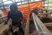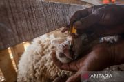 Peternak memberikan madu propolis pada hewan ternaknya di Rangkasbitung, Lebak, Banten, Senin (16/5/2022). Para peternak kambing setempat mengantisipasi penyebaran serangan wabah penyakit mulut dan kuku (PMK) dengan memberikan obat herbal seperti madu propolis kepada hewan ternaknya setiap hari. ANTARA FOTO/Muhammad Bagus Khoirunas/pras.