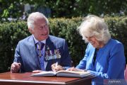 Pangeran Charles dari Inggris dan Duchess of Cornwall Camilla menandatangani buku tamu, ketika menghadiri upacara untuk menghormati veteran Kanada, pada hari kedua Tur Kerajaan 2022 Kanada, di National War Memorial. di Ottawa, Ontario, Kanada, Kamis (18/5/2022). ANTARA FOTO/Reuters-Carlos Osorio/hp.