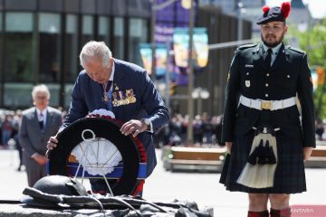 Pangeran Charles dari Inggris meletakkan karangan bunga, saat upacara untuk menghormati veteran Kanada, pada hari kedua Tur Kerajaan 2022 Kanada, di National War Memorial di Ottawa, Ontario, Kanada, Kamis (18/5/2022). ANTARA FOTO/Reuters-Carlos Osorio/hp.