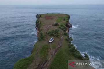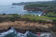 Pengunjung berada di atas tebing Karang Bolong, Pacitan, Jawa Timur, Sabtu (21/5/2022). Destinasi wisata Karang Bolong yang menyuguhkan pemandangan tebing dan pantai selatan Jawa Timur tersebut merupakan destinasi favorit di Kabupaten Pacitan. ANTARA FOTO/Hendra Nurdiyansyah/rwa.