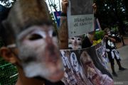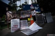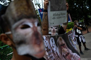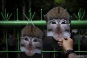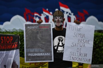 Pengunjuk rasa yang tergabung dalam Koalisi Monyet Ekor Panjang berunjuk rasa di depan Kantor Kementerian Lingkungan Hidup dan Kehutanan, Jakarta, Senin (23/5/2022). Mereka mendesak pemerintah segera melarang praktik perdagangan satwa liar monyet ekor panjang (Macaca fascicularis) yang marak terjadi di pasar hewan dan secara daring di Indonesia. ANTARA FOTO/Sigid Kurniawan/wsj.