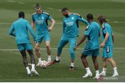 Pesepak bola Real Madrid Gareth Bale (kedua kiri) dan Karim Benzema (tengah) menjalani latihan dengan rekan-rekan satu timnya menjelang final Piala Champions, di Ciudad Real Madrid, Valdebebas, Spanyol, Selasa (24/5/2022), Real Madrid akan berhadapan dengan Liverpool dalam laga final Piala Champions yang digelar di Stadion Parc des Prince, Paris, Minggu (29/5/2022). ANTARA FOTO/Reuters- Susana Vera/hp.