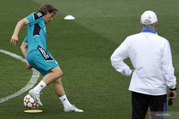 Pesepak bola Real Madrid Luka Modric (kiri) berlatih diawasi pelatihnya Carlo Ancelotti saat tim ini menjalani menjelang final Piala Champions, di Ciudad Real Madrid, Valdebebas, Spanyol, Selasa (24/5/2022), Real Madrid akan berhadapan dengan Liverpool dalam laga final Piala Champions yang digelar di Stadion Parc des Prince, Paris, Minggu (29/5/2022). ANTARA FOTO/Reuters- Susana Vera/hp.