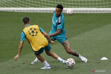 Pesepak bola Real Madrid Lucas Vazquez dan Eder Militao menjalani latihan dengan rekan-rekan satu timnya menjelang final Piala Champions, di Ciudad Real Madrid, Valdebebas, Spanyol, Selasa (24/5/2022), Real Madrid akan berhadapan dengan Liverpool dalam laga final Piala Champions yang digelar di Stadion Parc des Prince, Paris, Minggu (29/5/2022). ANTARA FOTO/Reuters- Susana Vera/hp.