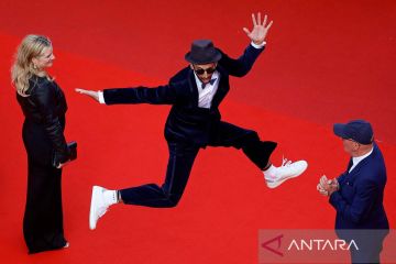 Aktor JR melompat di karpet merah festival film Cannes sebelum screening film "L'innocent", di Prancis (24/5/2022). ANTARA FOTO/REUTERS/Sarah Meyssonnier/aww.