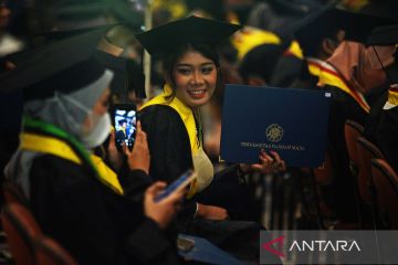 Wisudawati Universitas Gadjah Mada (UGM) berfoto saat mengikuti Wisuda Program Sarjana dan Diploma TA 2021/2022 yang digelar secara luring di GSP UGM, Sleman, D.I Yogyakarta, Rabu (25/5/2022). Wisuda Program Sarjana dan Diploma TA 2021/2022 UGM merupakan yang pertama kali digelar secara luring sejak pandemi COVID-19 dengan jumlah wisudawan dan wisudawati sebanyak 1.023 orang. ANTARA FOTO/Andreas Fitri Atmoko/aww.