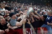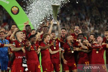 Pemain AS Roma Lorenzo Pellegrini mengangkat trofi saat merayakan kemenangan bersama rekan setimnya usai pertandingan babak final Liga Konferensi Eropa 2021/2022 melawan Feyenoord di Arena Kombetare, Tirana, Albania, Rabu (25/5/2022). AS Roma jadi juara liga tersebut usai menang 1-0 atas Feyenoord. ANTARA FOTO/REUTERS/Marko Djurica/wsj.