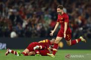 Pemain AS Roma Matias Vina merayakan kemenangan timnya usai pertandingan babak final Liga Konferensi Eropa 2021/2022 melawan Feyenoord di Arena Kombetare, Tirana, Albania, Rabu (25/5/2022). AS Roma jadi juara liga tersebut usai menang 1-0 atas Feyenoord. ANTARA FOTO/REUTERS/Marko Djurica/wsj.