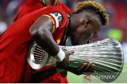 Pemain AS Roma Tammy Abraham mencium trofi saat merayakan kemenangan bersama rekan setimnya usai pertandingan babak final Liga Konferensi Eropa 2021/2022 melawan Feyenoord di Arena Kombetare, Tirana, Albania, Rabu (25/5/2022). AS Roma jadi juara liga tersebut usai menang 1-0 atas Feyenoord. ANTARA FOTO/REUTERS/Florion Goga/wsj.