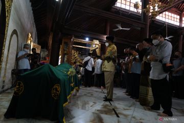 Romo Paroki Gereja Katholik Kumetiran Yohanes Dwi Harsanto (kedua kanan) mendoakan almarhum BuyaÊAhmad Syafii Maarif saat prosesi penyemayaman di Masjid Gede Kauman, Yogyakarta, Jumat (27/5/2022). Ketua Pimpinan Pusat Muhammadiyah Tahun 1998-2005, BuyaÊAhmad Syafii MaarifÊwafat pada Jumat (27/5/2022) pukul 10.15 WIB di RS PKU Muhammadiyah Gamping, Sleman, Daerah Istimewa Yogyakarta (DIY) karena sakit. ANTARA FOTO/Andreas Fitri Atmoko/hp.