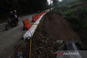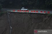 Pengendara melintasi jalan Solo-Selo-Borobudur (SSB) yang longsor sebagian di Genting, Cepogo, Boyolali, Jawa Tengah, Selasa (31/5/2022). Jalur SSB atau Boyolali-Magelang yang berada di kawasan lereng Gunung Merapi dan Merbabu tersebut rawan longsor jika saat hujan, sehingga pengendara diharapkan untuk waspada. ANTARA FOTO/Aloysius Jarot Nugroho/rwa.