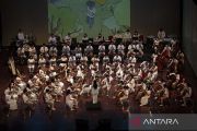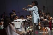 Konduktor TRUST Orchestra Nathania Karina memimpin jalannya konser bertajuk Hari Ini Indah di Taman Ismail Marzuki, Jakarta, Sabtu (4/6/2022). Trinity Optima Production dan TRUST Orchestra menggelar konser musik orkestra dengan 100 persen musisi muda tanah air yang bertujuan untuk memberikan kesempatan pada bibit-bibit orkestra muda nasional yang selama ini masih belum banyak tereksplorasi. ANTARA FOTO/Sigid Kurniawan/aww.