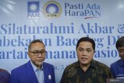 Menteri BUMN Erick Thohir (kanan) bersama Ketua Umum Partai Amanat Nasional (PAN) Zulkifli Hasan (kiri) menjawab pertanyaan awak media usai menghadiri Silaturahmi Akbar PAN di kantor DPP PAN, Jakarta, Minggu (5/6/2022). Dalam kesempatan tersebut Menteri BUMN bertukar pikiran mengenai situasi ekonomi ke depan. ANTARA FOTO/Dhemas Reviyanto/hp.