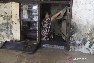 Seorang ibu membuka pintu rumahnya yang dilanda banjir di Kebon Pala, Kampung Melayu, Jakarta, Selasa (7/6/2022). Badan Penanggulangan Bencana Daerah (BPBD) DKI Jakarta menyebutkan sebanyak 27 rukun tetangga (RT) di Ibu Kota terendam banjir setinggi 40-170 centimeter akibat luapan Sungai Ciliwung yang dipicu air kiriman dari Bogor dan Depok. ANTARA FOTO/Aditya Pradana Putra/wsj.