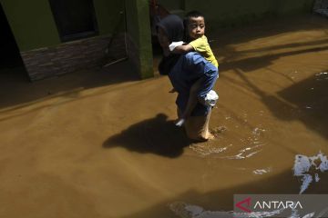 Seorang ibu sambil menggendong anaknya berjalan menembus banjir yang melanda permukiman padat penduduk di Kebon Pala, Kampung Melayu, Jakarta, Selasa (7/6/2022). Badan Penanggulangan Bencana Daerah (BPBD) DKI Jakarta menyebutkan sebanyak 27 rukun tetangga (RT) di Ibu Kota terendam banjir setinggi 40-170 centimeter akibat luapan Sungai Ciliwung yang dipicu air kiriman dari Bogor dan Depok. ANTARA FOTO/Aditya Pradana Putra/wsj.