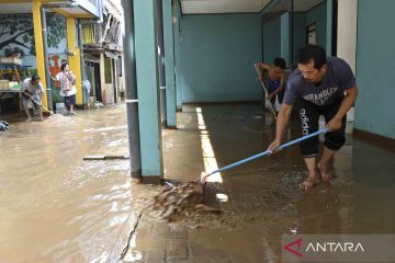 Warga membersihkan sisa lumpur akibat banjir yang melanda permukiman padat penduduk di Kebon Pala, Kampung Melayu, Jakarta, Selasa (7/6/2022). Badan Penanggulangan Bencana Daerah (BPBD) DKI Jakarta menyebutkan sebanyak 27 rukun tetangga (RT) di Ibu Kota terendam banjir setinggi 40-170 centimeter akibat luapan Sungai Ciliwung yang dipicu air kiriman dari Bogor dan Depok. ANTARA FOTO/Aditya Pradana Putra/wsj.