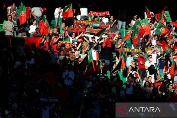 Pendukung Timnas Portugal menyaksikan pertandingan Portugal vs Republik Ceko pada UEFA Nations League di Stadion Jose Alvalade, Lisbon, Portugal, Kamis (9/6/2022). Seleccao das Quinas memetik kemenangan 2-0 atas Republik Ceko melalui gol Joao Cancelo dan Goncalo Guedes. ANTARA FOTO/via Reuters Connect/Pedro Fiuza/rwa.