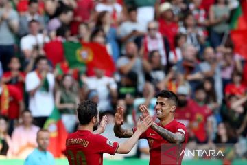 Pemain Portugal Joao Cancelo berselebrasi bersama Bernardo Silva usai mencetak gol ke gawang Republik Ceko pada pertandingan UEFA Nations League di Stadion Jose Alvalade, Lisbon, Portugal, Kamis (9/6/2022). Seleccao das Quinas memetik kemenangan 2-0 atas Republik Ceko melalui gol Joao Cancelo dan Goncalo Guedes. ANTARA FOTO/via Reuters Connect/Pedro Fiuza/rwa.