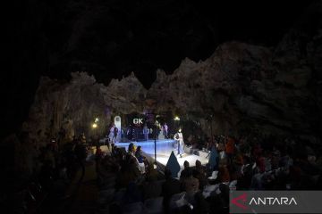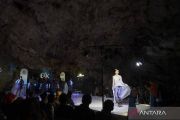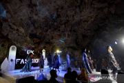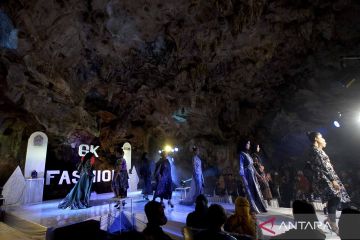 Sejumlah peragawati memperagakan busana batik saat peragaan busana di dalam Gua Rancang Kencana, Bleberan, Playen, Gunungkidul, Yogyakarta, Sabtu (11/6/2022). Peragaan busana yang digagas oleh Pemkab Gunungkidul itu menampilkan karya busana dari 13 industri kecil menengah (IKM) batik serta 12 desainer lokal untuk kembali menggeliatkan pariwisata serta perekonomian yang melemah akibat pandemi COVID-19. ANTARA FOTO/Andreas Fitri Atmoko/wsj.