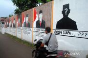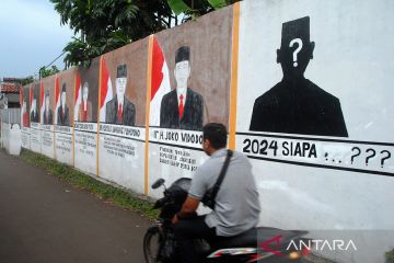 Seorang warga berjalan di dekat mural bergambar Presiden Joko Widodo di Kedung Halang, Kota Bogor, Jawa Barat, Senin (13/6/2022). Komisi Pemilihan Umum (KPU) akan memulai tahapan Pemilu 2024 dengan perencanaan program, anggaran dan penyusunan peraturan pelaksanaan pemilu serta mulai menghitung mundur menuju hari pemungutan suara pemilu yang telah ditetapkan pada Rabu 14 Februari 2024. ANTARA FOTO/Arif Firmansyah/rwa.