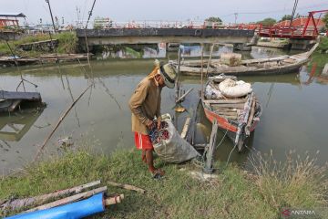 Warga memulung sampah dengan perahu miliknya di kampung nelayan Pabean udik, Indramayu, Jawa Barat, Minggu (19/6/2022). Pemerintah menargetkan penurunan angka kemiskinan ekstrem hingga nol persen di 212 kabupaten/kota pada tahun 2024 seiring dengan dikeluarkannya Instruksi Presiden (Inpres) Nomor 4 tahun 2022 tentang Percepatan Penghapusan Kemiskinan Ekstrem. ANTARA FOTO/Dedhez Anggara/wsj.
