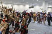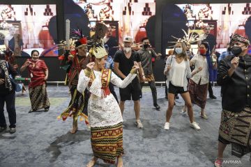 Penari tampil pada pagelaran budaya "Langgam Pancarona, Dahayu Nusantara" di Bandara Internasional Soekarno-Hatta, Tangerang, Banten, Minggu (26/6/2022). Menteri BUMN Erick Thohir mengatakan bandara internasional sebagai gerbang masuk ke Indonesia harus menjadi panggung tetap bagi para seniman dan budayawan lokal untuk mementaskan karya seni dan budaya nusantara. ANTARA FOTO/Dhemas Reviyanto/hp.