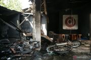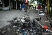 Bangkai motor yang terbakar tergeletak usai terjadi kericuhan di Babarsari, Sleman, DI Yogyakarta, Senin (4/7/2022). Kericuhan yang terjadi antara dua kelompok masyarakat tersebut merupakan buntut dari kasus penganiayaan yang terjadi di sebuah tempat karaoke di Babarsari. ANTARA FOTO/Hendra Nurdiyansyah/hp.