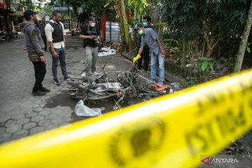 Anggota polisi melakukan olah tempat kejadian perkara kericuhan di Babarsari, Sleman, DI Yogyakarta, Senin (4/7/2022). Kericuhan yang terjadi antara dua kelompok masyarakat tersebut merupakan buntut dari kasus penganiayaan yang terjadi di sebuah tempat karaoke di Babarsari. ANTARA FOTO/Hendra Nurdiyansyah/hp.