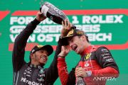 Pembalap Ferrari Charles Leclerc yang menjadi juara pertama balapan F1 GP Austria disemprot sampanye oleh pemenang ketiga pembalap Mercedes Lewis Hamilton di podium Red Bull Ring, Spielberg, Austria , Minggu (10/7/2022). Charles Leclerc menjadi pembalap Ferrari pertama sejak Schumacher (2003) yang berhasil menjuarai GP Austria. ANTARA FOTO/REUTERS/Leonhard Foeger/aww.
