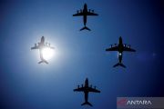 Pesawat jenis Airbus A400M milik Angkatan Udara Prancis dan tiga pesawat angkut militer jenis Airbus A400M dari Angkatan Udara Spanyol, Angkatan Udara Belgia dan Angkatan Udara Jerman berlatih terbang untuk parade militer tradisional Hari Bastille di Paris, Prancis, Senin (11/7/2022). ANTARA FOTO/REUTERS/Sarah Meyssonnier/wsj.