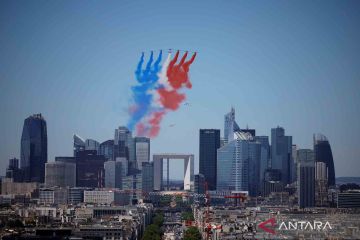 Pesawat tempur alpha jet milik Angkatan Udara Prancis Patrouille de France terbang di atas kawasan bisnis La Defense saat latihan parade militer tradisional Hari Bastille di Paris, Prancis, Senin (11/7/2022). ANTARA FOTO/REUTERS/Sarah Meyssonnier/wsj.