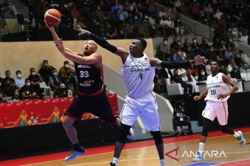 Pebasket Indonesia Marques Terrell Bolden (tengah) melakukan 'lay up' ke ring tim nasional Arab Saudi dalam laga babak penyisihan Grup A FIBA Asia Cup 2022 di Istora Gelora Bung Karno, Senayan, Jakarta, Selasa (12/7/2022). ANTARA FOTO/Aditya Pradana Putra/rwa.