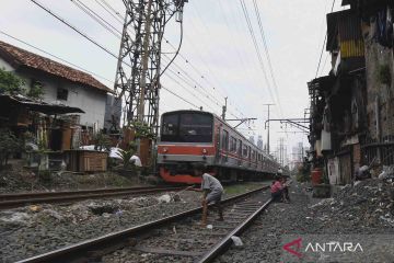 Anak-anak bermain di rel kereta api di api di kawasan Pejompongan, Jakarta, Jumat (15/7/2022). Badan Pusat Statistik (BPS) mencatat jumlah penduduk miskin di Indonesia pada Maret 2022 berjumlah 26,16 juta orang atau menurun 1,38 juta orang (0,60 persen) dibandingkan Maret 2021. ANTARA FOTO/Hafidz Mubarak Ahmad/wsj.