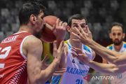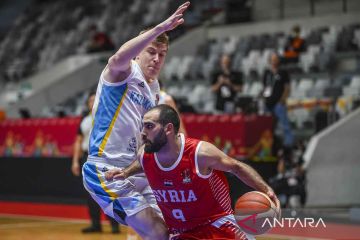 Pebasket Suriah Abdulwahab Alhamwi (kiri) berebut bola dengan pebasket tim nasional Kazakhstan dalam babak penyisihan Grup C FIBA Asia Cup 2022 di Istora Gelora Bung Karno, Senayan, Jakarta, Minggu (17/7/2022). Suriah menang atas Kazakhstan dengan skor 77-67. ANTARA FOTO/Galih Pradipta/rwa.