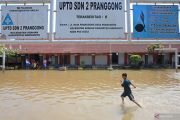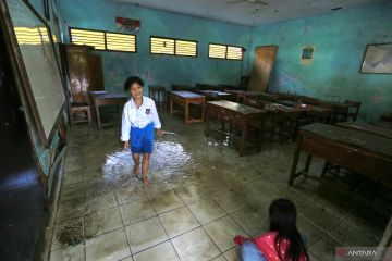Seorang anak bermain air saat banjir menggenangi SDN 02 Pranggong, Kecamatan Arahan, Indramayu, Jawa Barat, Senin (18/7/2022). Pihak sekolah terpaksa meliburkan siswanya pada hari pertama masuk sekolah karena sejumlah ruang kelas terendam banjir akibat luapan sungai Cipelang. ANTARA FOTO/Dedhez Anggara/foc.