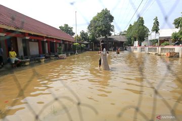 Sejumlah anak bermain air saat banjir menggenangi SDN 02 Pranggong, Kecamatan Arahan, Indramayu, Jawa Barat, Senin (18/7/2022). Pihak sekolah terpaksa meliburkan siswanya pada hari pertama masuk sekolah karena sejumlah ruang kelas terendam banjir akibat luapan sungai Cipelang. ANTARA FOTO/Dedhez Anggara/foc.
