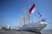 KRI Bima Suci-945 bersandar saat pelepasan Satgas Pelayaran Kartika Jala Krida (KJK) 2022 di Dermaga Madura Tengah, Koarmada II, Surabaya, Jawa Timur, Selasa (19/7/2022). KJK tersebut diikuti oleh 102 Taruna AAL Tingkat III Angkatan ke-69 selama 91 hari dengan rute Surabaya-Jakarta-Singapura-Sabah-Tual-Townsville-Sydney-Cairns-Darwin-Bali-Surabaya. ANTARA FOTO/Nova Wahyudi/foc.