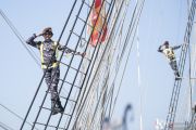Taruna Akademi Angkatan Laut (AAL) Tingkat III Angkatan ke-69 melaksanakan peran parade roll di atas KRI Bima Suci-945 saat pelepasan Satgas Pelayaran Kartika Jala Krida (KJK) 2022 di Dermaga Madura Tengah, Koarmada II, Surabaya, Jawa Timur, Selasa (19/7/2022). KJK tersebut diikuti oleh 102 Taruna AAL Tingkat III Angkatan ke-69 selama 91 hari dengan rute Surabaya-Jakarta-Singapura-Sabah-Tual-Townsville-Sydney-Cairns-Darwin-Bali-Surabaya. ANTARA FOTO/Nova Wahyudi/foc.