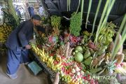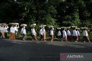 Warga mengumpulkan hasil bumi saat perayaan adat Seren taun di Cigugur, Kuningan, Jawa Barat, Jumat (22/7/2022). Tradisi Seren taun ini merupakan perwujudan atas rasa syukur masyarakat Cigugur yang mayoritas petani terhadap karunia sang pencipta dan dirayakan pada 22 Raya Agung tahun Saka Sunda. ANTARA FOTO/Dedhez Anggara/pras.