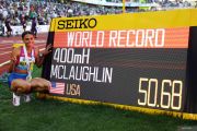 Peraih medali emas Sydney McLaughlin dari AS berpose di depan papan penunjuk waktu yang menunjukkan waktu yang ia berhasil ia raih saat merebut juara dalam final lari gawang 400 meter putri dan memecahkan rekor dunia baru, di Lapangan Hayward, Eugene, Oregon, Amerika Serikat, Jumat (22/7/2022). Sydney McLaughlin memecahkan rekor dunia lari gawang putri atas namanya sendiri dengan catatan waktu 50,68 detik pada kejuaraan ini. ANTARA FOTOReuters-Kai Pfaffenbach/hp.
