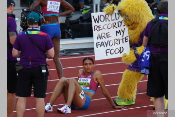 Peraih medali emas Sydney McLaughlin dari AS merayakan kemenangan bersama maskot resmi Legend the Bigfoot setelah ia memenangkan final lari gawang 400 meter putri dan memecahkan rekor dunia baru, di Lapangan Hayward, Eugene, Oregon, Amerika Serikat, Jumat (22/7/2022). Sydney McLaughlin memecahkan rekor dunia lari gawang putri atas namanya sendiri dengan catatan waktu 50,68 detik pada kejuaraan ini. ANTARA FOTOReuters-Mike Segar/hp.
