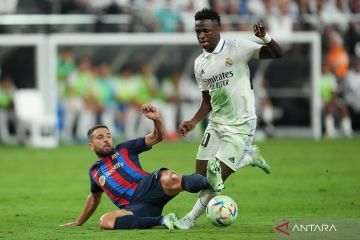 Pemain Barcelona Jordi Alba (kiri) menekel pemain Real Madrid Vinicius Jose Paixao (Vinicius Junior) dalam laga persahabatan pramusim di Las Vegas, Nevada, AS, Sabtu (23/7/2022). Barcelona menang 1-0 dalam laga itu. ANTARA FOTO/REUTERS/Stephen R. Sylvanie-USA TODAY Sports/foc.