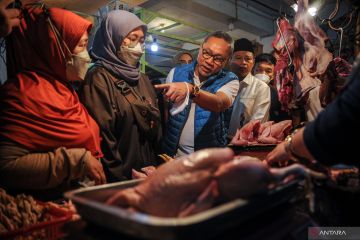 Menteri Perdagangan Zulkifli Hasan berbincang dengan warga saat meninjau harga kebutuhan pokok di Pasar Tradisional Cicalengka, Kabupaten Bandung, Jawa Barat, Senin (25/7/2022). Dalam kunjungan kerjanya di Kabupaten Bandung, Menteri Perdagangan meninjau harga kebutuhan pokok di pasar tradisional serta meninjau implementasi program digitalisasi pasar rakyat. ANTARA FOTO/Raisan Al Farisi/foc.