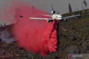 Pesawat pemadam menjatuhkan bahan pencegah api untuk menekan timbulnya titik api tambahan di lokasi sekitar kebakaran Oak Fire di Mariposa City, California, AS, Minggu (24/7/2022). ANTARA FOTO/REUTERS/David Swanson/foc.