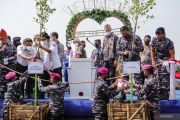 Menteri Lingkungan Hidup dan Kehutanan Siti Nurbaya Bakar (ketiga kiri) bersama Kepala Staf Angkatan Laut Laksamana TNI Yudo Margono (ketiga kanan) menunjukkan bibit mangrove yang akan ditanam di Tanjung Pasir, Kabupaten Tangerang, Banten, Selasa (26/7/2022). TNI AL menggelar penanaman 1.000.377 bibit mangrove secara serentak di 77 lokasi di Indonesia untuk memperingati Hari Mangrove Sedunia yang jatuh pada tanggal 26 Juli. ANTARA FOTO/Fauzan/hp.