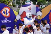 Maskot Piala Dunia Bola Basket FIBA 2023 menyapa sejumlah anak usai diluncurkan di gedung Sarinah, Jakarta, Sabtu (30/7/2022). Maskot bernama "JIP" tersebut merupakan penggabungan huruf depan ketiga negara tuan rumah Piala Dunia Bola Basket FIBA 2023 yakni Jepang, Indonesia, dan Philippina. ANTARA FOTO/Dhemas Reviyanto/hp.