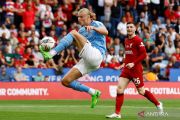 Pemain Manchester City Erling Braut Haaland mengontrol bola saat melawan Liverpool dalam laga Community Shield di King Power Stadium, Leicester, Inggris, Sabtu (30/7/2022). Liverpool menang dengan skor 3-1. ANTARA FOTO/Action Images via Reuters/Andrew Boyers/foc.