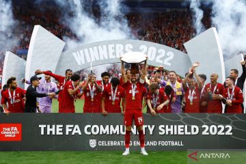 Kapten Liverpool Jordan Henderson mengangkat trofi bersama rekan setimnya usai menang melawan Manchester City dalam laga Community Shield di King Power Stadium, Leicester, Inggris, Sabtu (30/7/2022). Liverpool menang dengan skor 3-1. ANTARA FOTO/Action Images via Reuters/Andrew Boyers/foc.