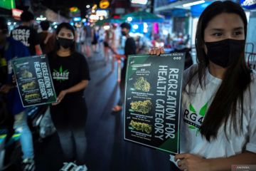 Petugas penjualan menunjukkan beberapa pilihan produk ganja yang dijual di depan toko ganja RG420, di Khaosan Road, salah satu tempat wisata favorit di Bangkok, Thailand, Minggu (31/7/2022). ANTARA FOTO/Reuters-Athit Perawongmetha/hp.