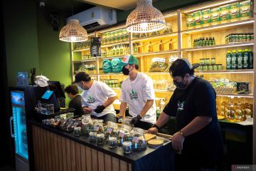 Petugas penjualan menyiapkan ganja di toko ganja RG420, di Khaosan Road, salah satu tempat wisata favorit di Bangkok, Thailand, Minggu (31/7/2022). ANTARA FOTO/Reuters-Athit Perawongmetha/hp.